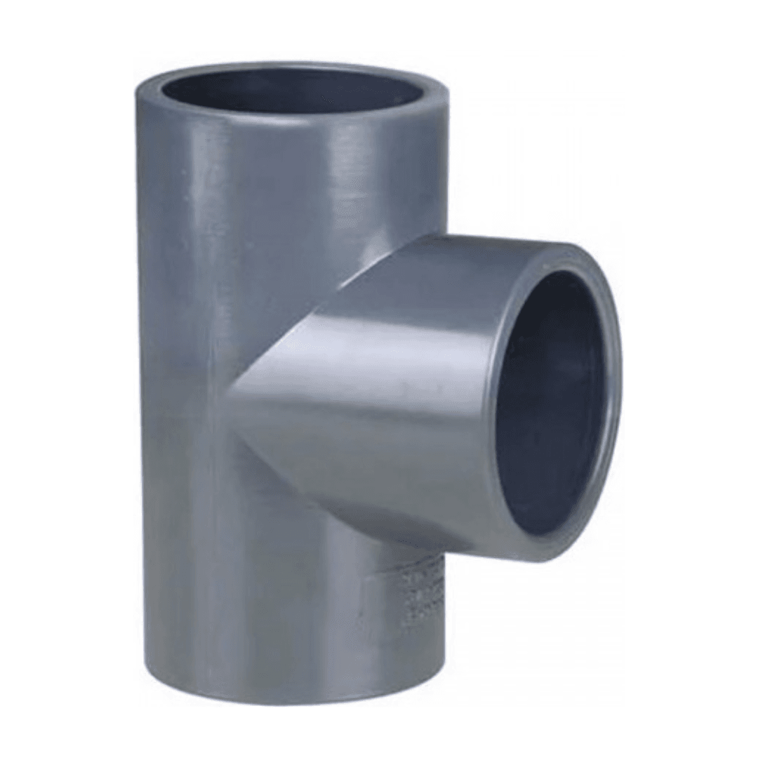 Standardni PVC T-kos z lepilnimi priključki. Uporabimo ga na mestih, kjer želimo bazenske inštalacije razdeliti v 3 veje.